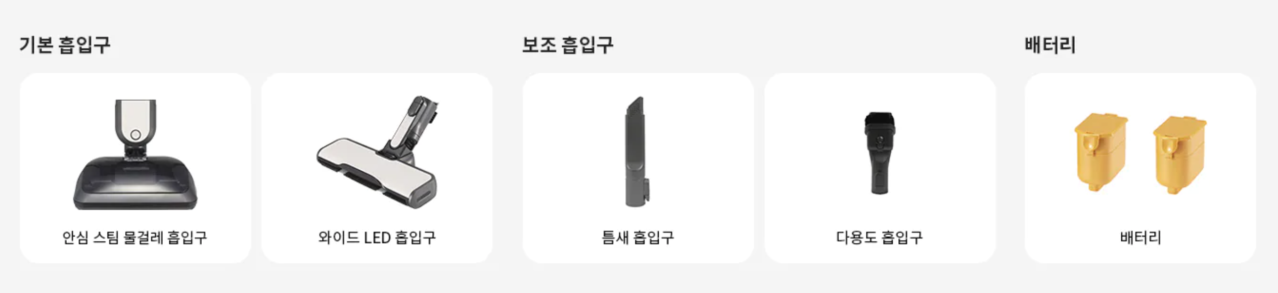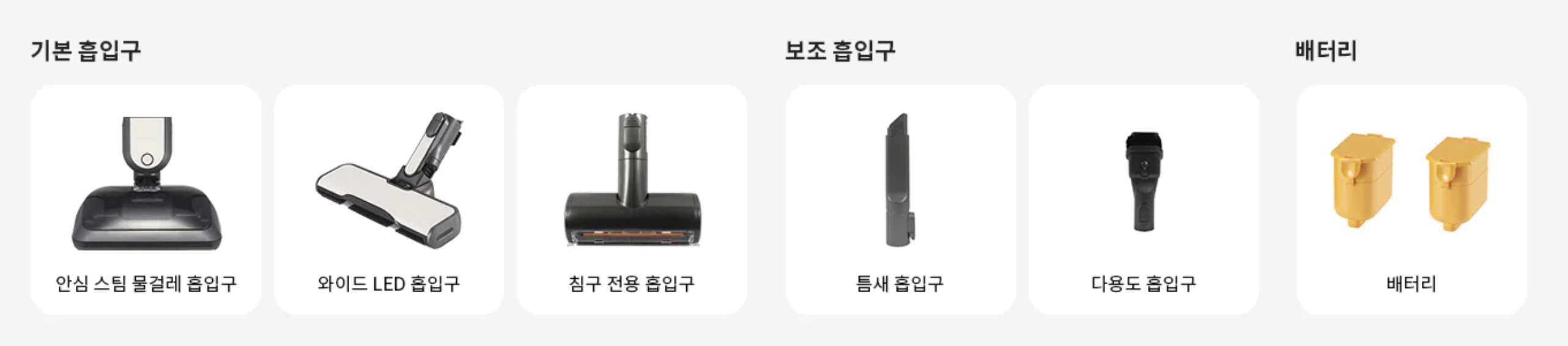 그리고 가장 중요한 차이는 기본흡입구 구성 차이입니다. AU9982WD 모델명 제품들은 안심 스팀 물걸레 흡입구, 와이드LED흡입구, 침구 전용 흡입구로 구성되어 있습니다. 보조흡입구는 틈새, 다용도 그리고 배터리 2개 조합입니다.