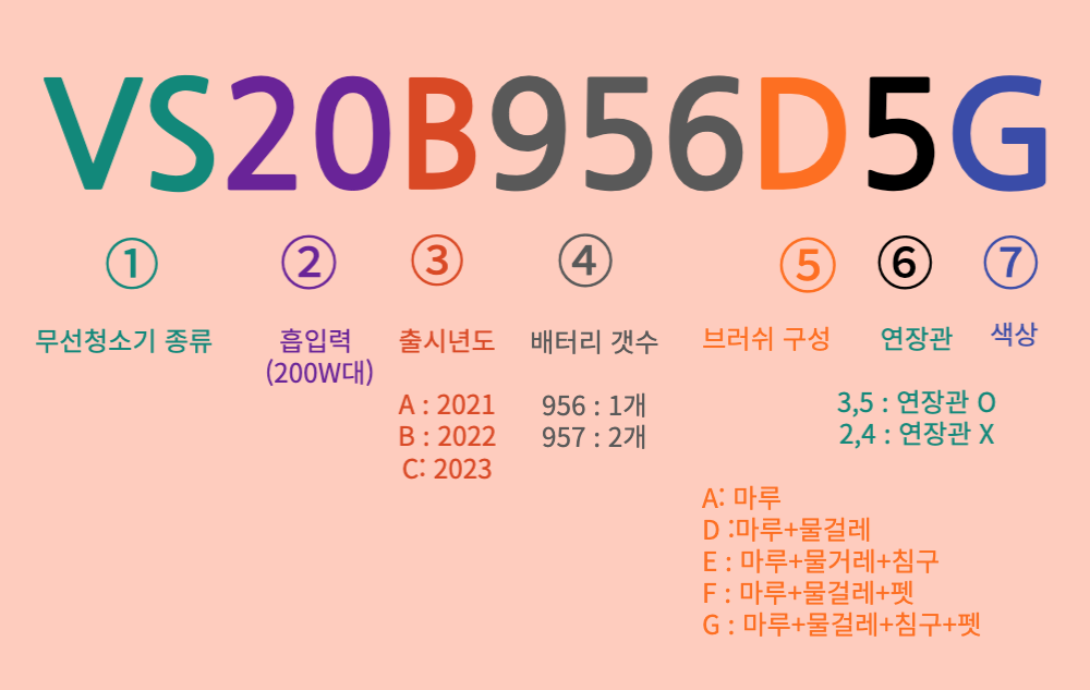 956은 배터리 갯수 1개를 뜻하고, 957은 배터리 2개 구성으로 가격이 올라갑니다. 다음 알파벳 D는 브러쉬 구성입니다. D는 마루와 물걸레 옵션이고, 애완동물을 키우는 경우에는 F 펫브러시 옵션이 좋겠죠. G 경우는 모든 브러시가 포함된 가장 비싸고 고사양 모델입니다. 주로 사용하는 청소 습관이나 스타일에 따라 선택하면 좋을 것 같고요. 고가의 프리미엄 제품이다 보니 좀 더 오래 사용하기 위해서 또는 평수가 넓거나 마루흡입 후 물걸레청소나 침구청소까지 한다면 넉넉한 배터리 2개가 좋을 수 있겠죠!