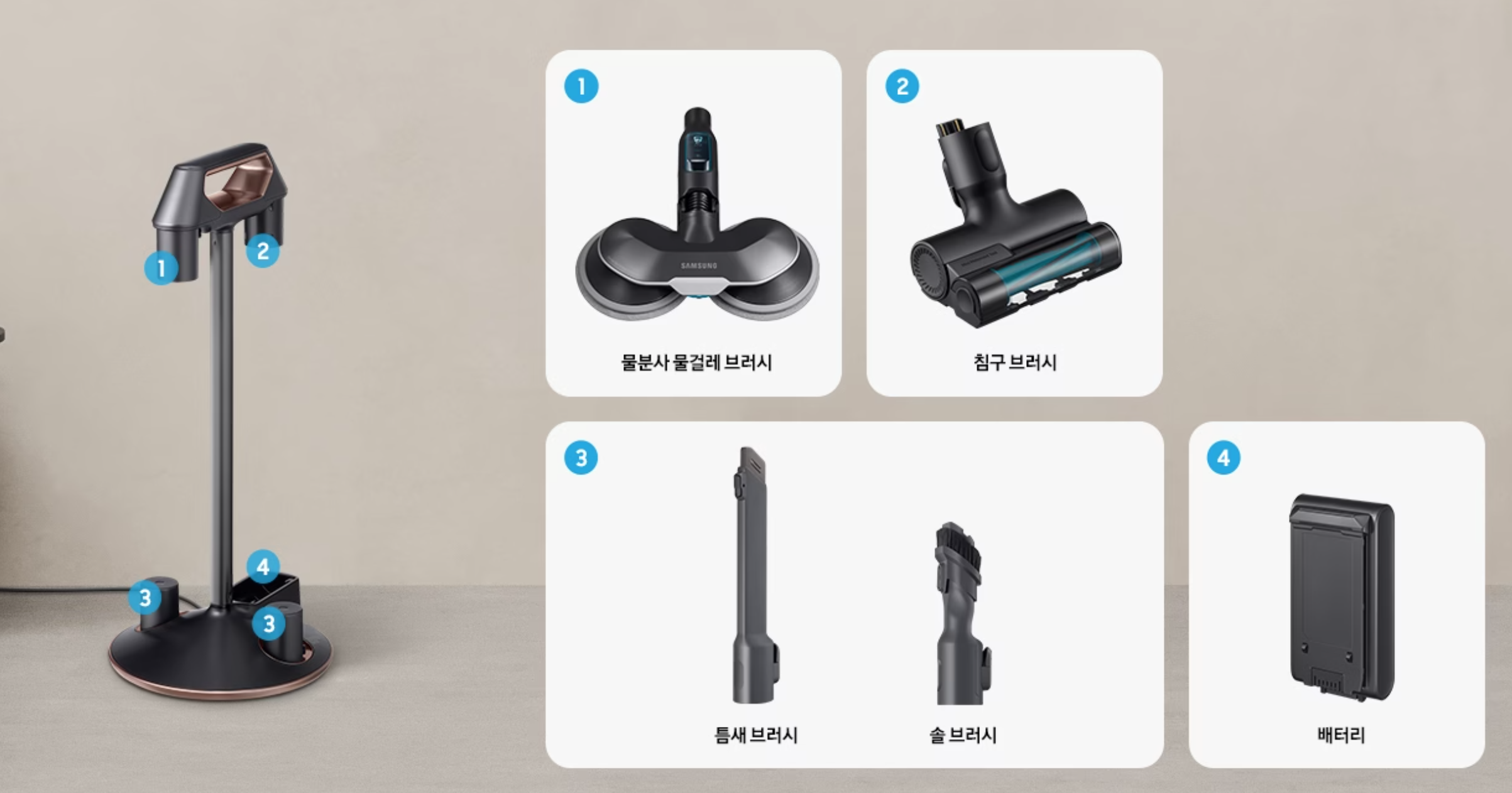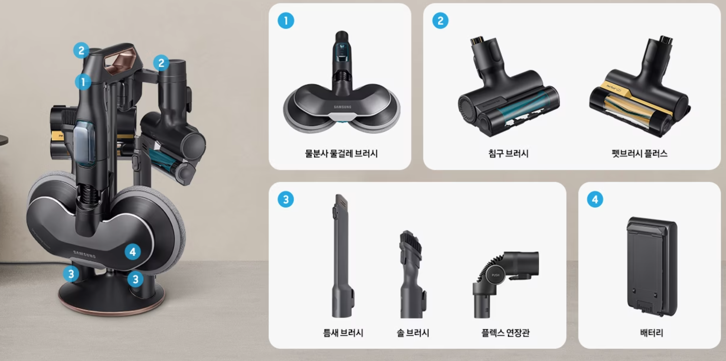 산토리니 베이지, 페블 그레이, 모닝블루, 이브닝 코랄 4가지 색상이 있습니다. 집안의 인테리어 역할까지 할 수 있는 중후하고 고급스러운 파스텔톤 색상과 디자인을 보여주고 있습니다. 모델명 색상에 따라 구성에 차이가 있습니다. 오렌지 색상의 비스포크 제트청소기 VS20B957G5C 모델만 배터리 2개 그리고 마루 물걸레 침구 펫 모두 포함된 풀옵션 청소기라고 볼 수 있습니다.